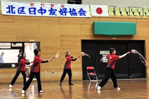 開会式では、まず、 両国国歌の斉唱と来賓挨拶が行われ、 その後、 日本太極柔力球協会による 「365日の紙飛行機」 に合わせてデモンストレーションが披露されました。準備体操として 「北区の歌」 に振り付けされた 「さくら体操」 で体をほぐしてから競技が始まりました。